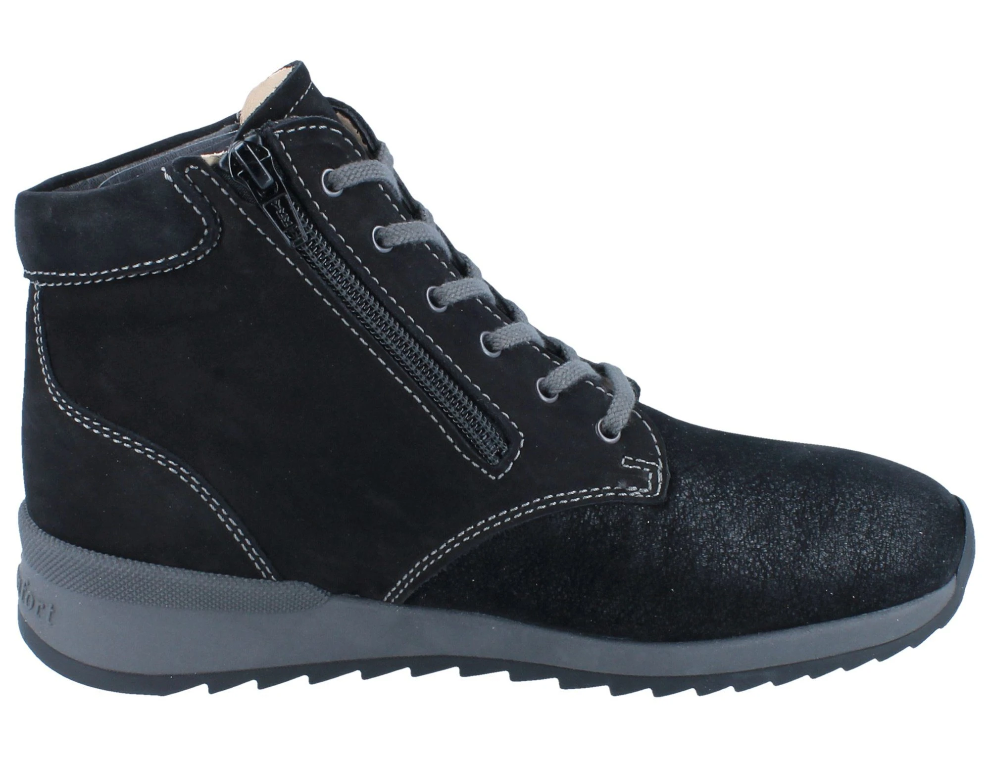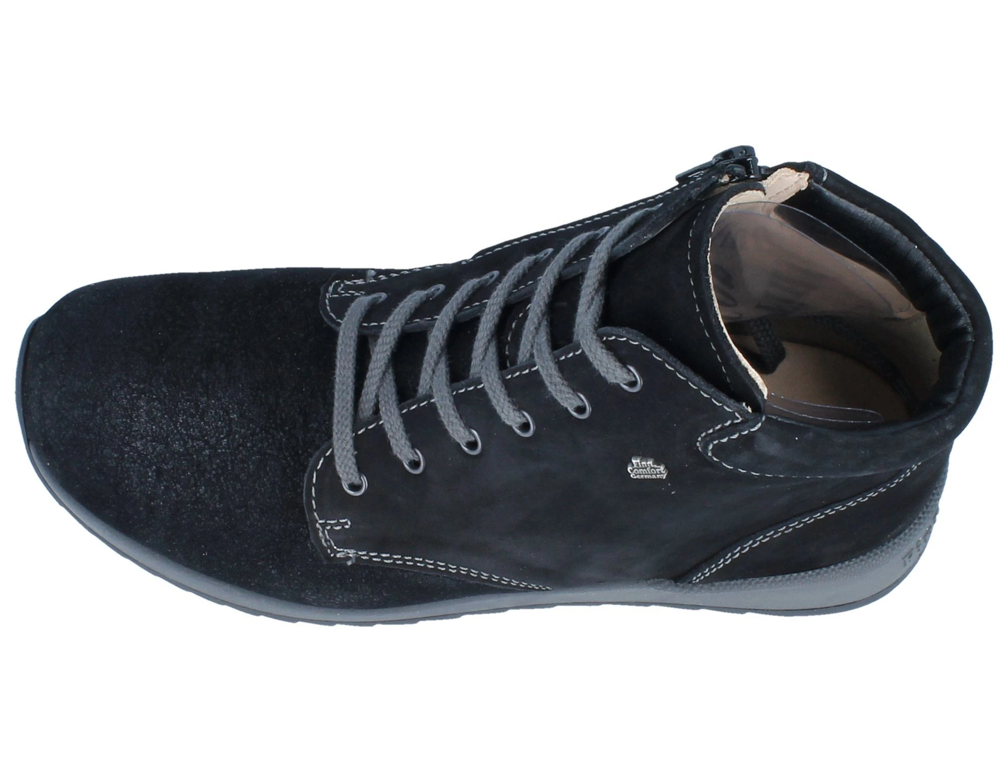Trient ist ein knöchelhoher Bequemschnürhalbschuh für Damen von FinnComfort. Er gehört zu der Serie FinnStretch und ist für empfindliche Füße (normale Breite – Schuhweite G) sehr gut geeignet. Durch den Stretch-Materialeinsatz werden Hallux Valgus, deformierte Zehen und anschwellende Füße nicht gedrückt, sondern entlastet. Die Schuhe bieten genügend Raum für die Zehen. Das Soft-Fußbett ist gepolstert, herausnehmbar und kann durch eigene orthopädische Einlagen ausgetauscht werden. Zusätzlich zu der Schnürung befindet sich an der Innenseite der Schnürhalbschuhe ein Reißverschluss, welcher das An- und Ausziehen der Schuhe erleichtert. Das komplette Lederinnenfutter bietet ein gutes Fußklima für weiteren Komfort. Über Nacht kann die gepolsterte Einlage zum Trocknen und Lüften aus dem Schuh genommen werden. Es ist ein sportlich bequemer Freizeitschuh für Damen, in dem Sie den ganzen Tag über den hohen Komfort genießen und Ihre Füße sich entspannen können.
